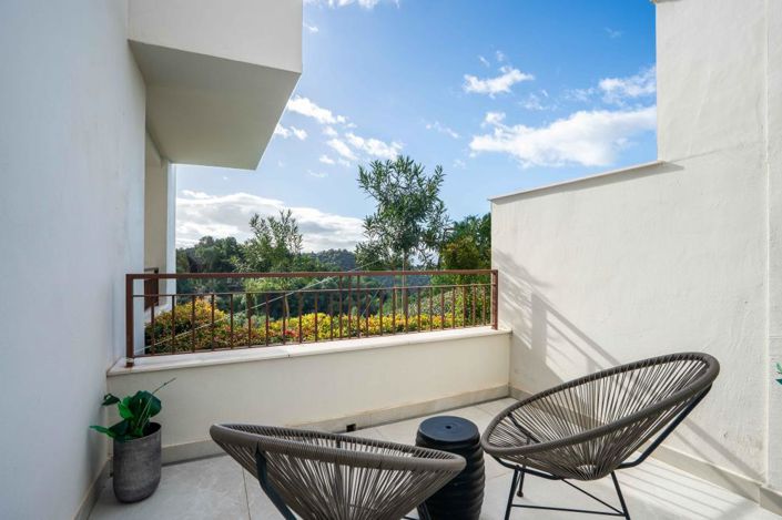 This is the first project for sale, consisting of 32 exclusive apartments with the best panoramic views at the highest part of the residential area. All homes have open views with a southwest orientation towards the Bay of Marbella and Gibraltar. The project comprises 4 blocks of only three-story homes with a contemporary 'open-plan' format but with a rustic aesthetic that integrates into the natural surroundings. The apartments have 2 and 3 bedrooms, and penthouses come with a solarium, large terraces, and a communal pool with native plant landscaping.The homes are delivered fully equipped, featuring top-brand finishes and are ready to move in. Additionally, each unit comes with an underground parking space and a storage room. Just 10 km from the beaches of Costa del Sol, Marbella and Puerto Banús, and 60 km from the international airport of Malaga, with access via the A-7 Mediterranean highway.