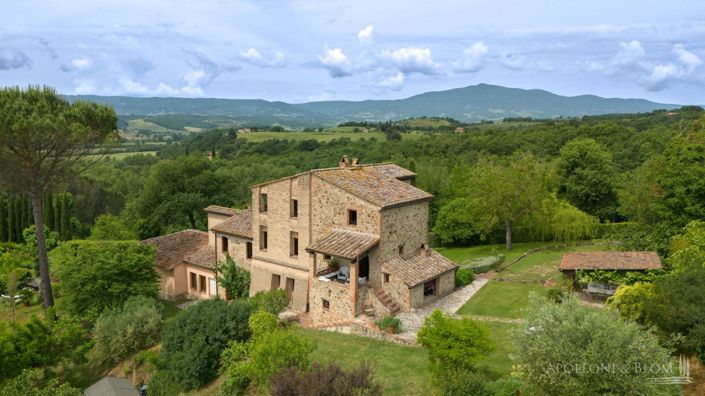 A stunning XVIII century country house finely upgraded with a heated pool, olive grove, vineyard, superb view, for sale in Città della Pieve. Set on the border with Tuscany and enchanting open views, stone country house tastefully restored featuring a heated pool, an olive grove, and vineyard. Decorated and furnished with antiques, this charming 200-year-old former farmhouse sits on a hill at over 300 meters above sea level and enjoys gorgeous views over the Tuscan and Umbrian countryside. On 20 acres/8 hectares of private land with old oaks, olive groves, a vineyard, it produces its organic wine and fragrant extra virgin olive oil. A period farmhouse with turret transformed into a unique and elegant country residence featuring stone walls, wooden beam ceilings, hand-made terracotta flooring, and original layouts, making the overall living areas very impressive with a classic and rustic atmosphere throughout. It consists of two separate homes. A manor residence is on three levels and offers a spacious living room and an eat-in kitchen with fireplaces on the first floor and two bedrooms in the turret. The ground floor houses a study with a library also used as a bedroom with a bathroom, and on the rear, a cellar, a utility room, and a laundry. On the other side of the building, a separate two-story residence offers a ground-floor living room and kitchen opening into a portico, a master bedroom with a changing room and ensuite bathroom, and two bedrooms with a bathroom on the first floor. In a private and discreet corner of the garden, slightly detached from the house, a heated swimming pool boasts a stone wall, Roman-style steps, a terracotta paved deck, and a changing room with a bathroom. Strategically located near Tuscany, within an easy reach to Città della Pieve, at only 5 km, ant to the historic towns of Montepulciano, Cetona, San Casciano de Bagni, Etruscan sites, the uncontaminated natural parks surrounding Lakes Trasimeno and Chiusi. The Etruscan city of Città della Pieve is rich in museums, archaeological sites, restaurants, bars, and wine shops. A classic period home, ready to live, boasting traditional features, ideal as an all-year-round retreat or as a holiday home, for private use or to host tourists for their vacations.