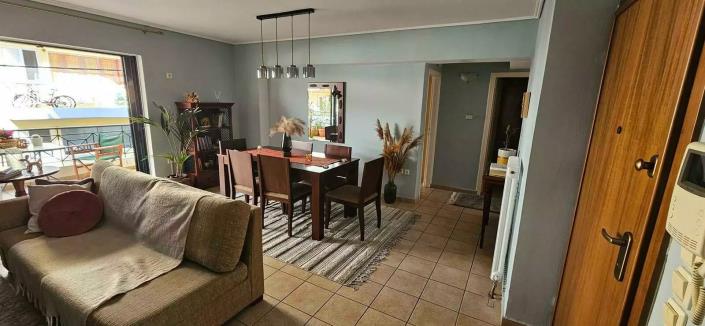 87 sq.m. apartment, facade, bright and airy, in excellent condition. It includes 2 bedrooms, a bathroom, living room, and kitchen. Features autonomous oil heating, aluminum frames, elevator, security door, storage room, double glazing, screens, verandas, air conditioning, solar water heater, and parking space.