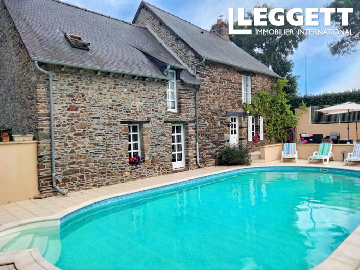 A swimming pool with a terrace, a landscaped garden, and a double garage.