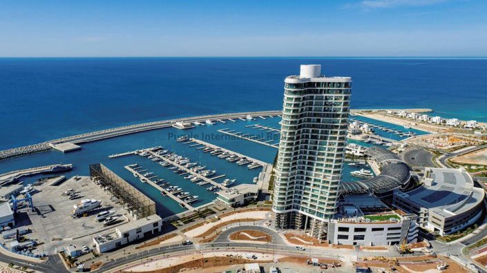 Rising high above the marina are two iconic towers, visible from both land and sea. Over 100 meters tall, the towers stand out in splendour like beacons welcoming seafarers, residents and visitors alike. Their twisting forms are inspired by the female figure and draped robes of caryatids and sculptures found at archaeological sites throughout Cyprus. Their facades are articulated with a filigree of warm-toned vertical sunshades suggestive of the woodcraft and detail of shipbuilding.