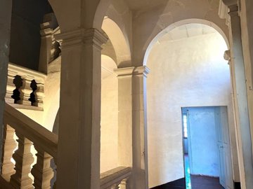 Un superbe escalier d’apparat avec de magnifiques balustres en pierre dessert les niveaux supérieurs