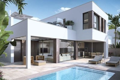 These quality second line beachfront detached villas with lovely sea views are located in Torre de la Horadada. These villas have a constructed build of 172m2 with three bedrooms and three bathrooms with plot sizes starting from 314m2. They have a private pool, a landscaped garden and a private garage.