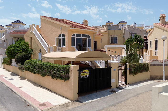Here we have a beautiful detached Villa boasting 2 bright double bedrooms and 2 family bathrooms one of which is en-suite to the master bedroom. There is a good size bright lounge/ diner plus a glazed in terrace, and a galley kitchen with its own door to access the garden area. There is a spacious garden are with plenty of room to relax or entertain freiends and family. There are two storage areas and a covered driveway to keep your car cool and out of the Sun. You will also find a small roof solarium. The large communual pool is a very short walk away and amenities the golf course and water park are also a short distance away. The blue flag beaches of Guardamar are only a 15 minute drive away. This type of property does not come on the market very often so an early viewing is highly reccomended.