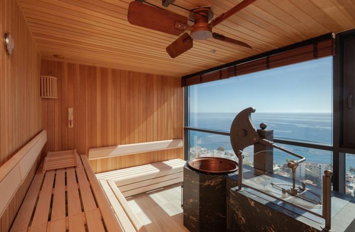 The heart of the home is its open-plan living, dining, and kitchen area, where floor-to-ceiling glass doors bring in natural light and open onto a wide veranda. This outdoor space extends daily living into the Mediterranean climate, creating the ideal setting for dining, entertaining, or simply enjoying the views of the coastline.