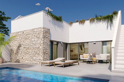 Ce programme immobilier propose différents types de propriétés et comprend plusieurs villas mitoyennes modernes de plain-pied, comprenant deux chambres et deux salles de bains, ainsi qu'un spacieux solarium. Au rez-de-chaussée, vous trouverez une cuisine ouverte avec coin repas et salon, deux chambres doubles (dont une avec salle de bains privative) avec placards intégrés et une salle de bains complète avec meubles de rangement, miroir et pare-douche. La cuisine est entièrement équipée avec tous les appareils électroménagers. Une piscine privée est disponible en option.