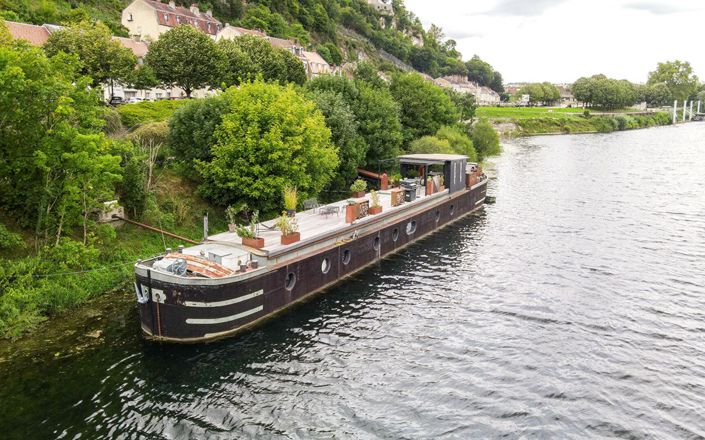Amarrée dans la boucle bisontine, cette péniche de 1956, rénovée en 2020, offre une expérience unique : habiter sur l'eau tout en restant au centre-ville. Son séjour lumineux, ses hublots anciens et ses finitions sur mesure composent un intérieur à la fois contemporain et chaleureux. Deux chambres de plain-pied et un atelier surélevé complètent l'espace de vie. La vaste terrasse en bois devient un lieu à part entière, idéale pour profiter du fleuve et de la lumière.