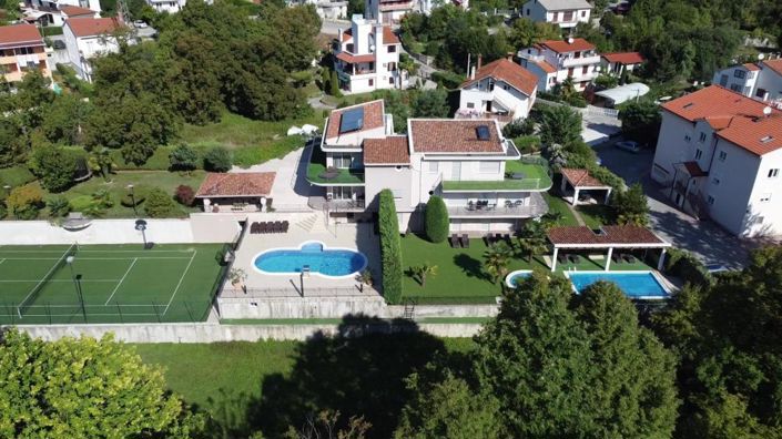 This beautiful residential space has the following layout: GROUND FLOOR: garage 105m2, covered passage, apartment, laundry room, tavern with toilet, jacuzzi, sauna, boiler room and storage - total area 287.13m2. FIRST FLOOR: open space living room, dining room, kitchen, large study and toilet (area 80.68m2), internal staircase, covered terrace, uncovered terrace 93.20m2 - gross area 372.78m2 SECOND FLOOR: 3 bedrooms, one of which has its own dressing room and bathroom, and the other two have access to the terrace and all in an area of 92.44m2 In the garden of the house there is a swimming pool and a paved sunbathing area, a gazebo with a barbecue and a private tennis court. The house is surrounded by greenery, located in a private and quiet location, and the drive to the beloved Opatija takes only 5 minutes. This property is 1 km from the sea directly by air, or 2.7 km by car (about 7 minutes).