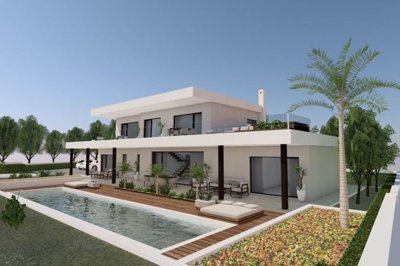 On the ground floor there is a spacious kitchen, one bedroom, two bathrooms, a spacious and well-lit living room with access to a covered terrace and a sunbathing area where there is a spacious 14-meter swimming pool.
