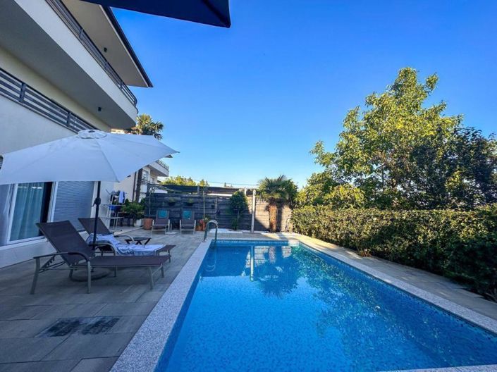 This exquisite house is ideal for families or as a rental investment. Spread across three floors, it is bathed in light and warmth, ensuring a delightful stay year-round. Each floor comprises a luxuriously appointed apartment featuring three spacious bedrooms, an open-plan living room with a modern kitchen and dining area, and two elegantly decorated bathrooms.The apartments are furnished with modern elegance, using the highest quality materials and appliances, designed with meticulous attention to detail to provide maximum comfort and functionality. The first and second floors boast balconies with spectacular panoramic views of the sea and surrounding nature, offering a perfect space to unwind and enjoy the stunning sunsets.The carefully landscaped yard provides an ideal outdoor space for socializing and relaxation. The terrace, complete with a sun deck and swimming pool, invites you to savor warm summer days, while the grill is perfect for preparing delightful outdoor meals. Three parking spaces ensure ample room for vehicles, enhancing the property's functionality and convenience.Situated in a highly sought-after location, the house is close to essential amenities such as shops, restaurants, schools, and public transport, making daily life exceptionally convenient. Additionally, the center of Opatija and the nearest beaches are just a seven-minute drive away, providing quick and easy access to the sea and the myriad pleasures of coastal living.This property represents a rare opportunity in the market, combining luxurious living spaces, a fantastic location, and numerous amenities.