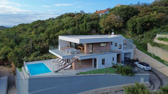 New villa in Hreljin, Bakar - quite a piece of modern art of architecture!We are pleased to present this exquisite villa located in Hreljin, near Rijeka, featuring a direct and almost panoramic view of the sea! The villa is complete and ready for its future owners. It boasts excellent quality construction, designer furnishings, an infinity pool, and top-notch amenities from brands like Daikin and Miele. Additional features include a sauna, jacuzzi, billiards room, and a stylish lounge area with incredible details, along with spacious terraces for relaxation.