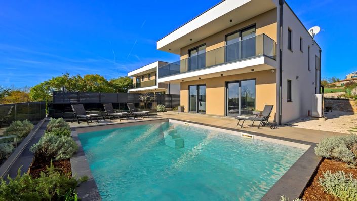 A modern 200 sq.m. villa with a swimming pool is for sale near the town of Svetvincenat, situated on a 560 sq.m. plot of land. Located in a quiet village, this property offers an authentic experience of a small Istrian town, providing privacy and a peaceful atmosphere away from the hustle and bustle, while still being conveniently close to the vibrant cities of Istria with a wide range of amenities. The villa stands out for its high-quality construction, ensuring long-term comfort and a superior living experience.The architecture seamlessly blends modern design with the natural surroundings, creating harmony without disturbing the environment. The villa is designed as a single residential unit spread over two floors. The ground floor features a spacious living room, dining area, and kitchen with access to a pergola-covered terrace that includes a summer kitchen, guest toilet, and technical room. The first floor houses four bedrooms, each with a private bathroom, and a terrace.The yard is beautifully landscaped, fenced, and enhanced by a heated swimming pool with a sunbathing area, adding to the property’s relaxing ambiance. With its excellent location, thoughtful layout, and comfortable amenities, this villa is an ideal choice for peaceful family living or as a lucrative investment for tourist rental. The sea is just 16 km away, making it easily accessible for day trips or beach outings. Ref: RE-U-36540Overall additional expenses borne by the Buyer of real estate in Croatia are around 7% of property cost in total, which includes: property transfer tax (3% of property value), agency/brokerage commission (3%+VAT on commission), advocate fee (cca 1%), notary fee, court registration fee and official certified translation expenses. Agency/brokerage agreement is signed prior to visiting properties.