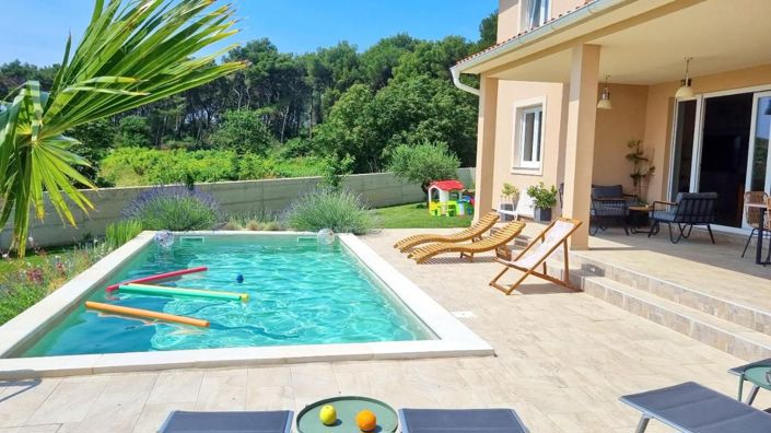 here concrete, thermal blocks, and sloped reinforced concrete slabsTriple-glazed windowsThanks to these features, the property has excellent insulation.One of the most modern heating and cooling systems has been installed, including hot water – the HITACHI 3C ecological system, ensuring minimal electricity costs.Electric blinds have been installed on the large glass wall on the ground floor.The pool is made of concrete (waterproof concrete), measuring 7.60m x 4.10m, with a finish of washed gravel and artificial stone edges using AstralPool technology. There is a sunbathing area around the pool.In addition to the pool, the outdoor space also features a summer kitchen with an outdoor toilet. Other outdoor rooms include a large storage area and a laundry room, ensuring plenty of storage space and an undisturbed stay.The property includes parking spaces and electric sliding gates for villa access. There is also a video intercom inside the house.Additional Advantage: This property has its own water well, approximately 56 meters deep, which is used for watering plants and surface cleaning. This results in minimal water bills.The property is sold fully furnished. Ref: RE-U-38250Overall additional expenses borne by the Buyer of real estate in Croatia are around 7% of property cost in total, which includes: property transfer tax (3% of property value), agency/brokerage commission (3%+VAT on commission), advocate fee (cca 1%), notary fee, court registration fee and official certified translation expenses. Agency/brokerage agreement is signed prior to visiting properties.
