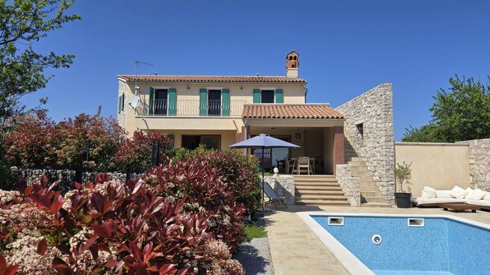 Perched on a sunny hilltop overlooking the sparkling Adriatic Sea, between the historic cities of Pula and Opatija, this delightful Mediterranean stone house is a true gem. Nestled near the picturesque town of Labin—where old-world charm meets modern living—this home perfectly blends Istrian tradition with contemporary elegance and comfort.Spanning 137 sq.m. on a generous 783 sq.m. plot, the house boasts three sun-filled bedrooms, each opening onto its own balcony with breathtaking views of the sea, lush greenery, and endless skies. Inside, natural stone walls, warm wooden accents, and soft Mediterranean hues create a cozy, inviting atmosphere, while modern touches like a sleek kitchen with osmosis-filtered drinking water and a stylish fireplace add a touch of luxury.The open-plan living and dining area flows effortlessly onto a spacious terrace framed by large glass walls, bringing the outdoors in. Step outside to your private pool and a beautifully landscaped garden—a true Mediterranean paradise bursting with fragrant herbs, colorful flower paths, and a peaceful nook made for relaxation. The terrace is perfect for long summer evenings spent dining al fresco or enjoying barbecues with family and friends.Additional features include a guest bathroom, a convenient ground-floor toilet, and a cool basement room ideal for a wine cellar or extra storage. Plus, an adjacent side plot offers exciting possibilities—expand your garden, create a kids’ playground, or plant your own olive grove!Fully fenced for privacy and security, the property also comes with a 70 m³ water tank, promoting eco-friendly, self-sufficient living. More than just a house, this is a lifestyle—whether you’re seeking a permanent home, a luxurious holiday retreat, or a profitable vacation rental.Breathe in the sea air, slow down, and savor the joy of living in harmony with nature and tradition. Ref: RE-U-40303Overall additional expenses borne by the Buyer of real estate in Croatia are around 7% of property cost in total, which includes: property transfer tax (3% of property value), agency/brokerage commission (3%+VAT on commission), advocate fee (cca 1%), notary fee, court registration fee and official certified translation expenses. Agency/brokerage agreement is signed prior to visiting properties.