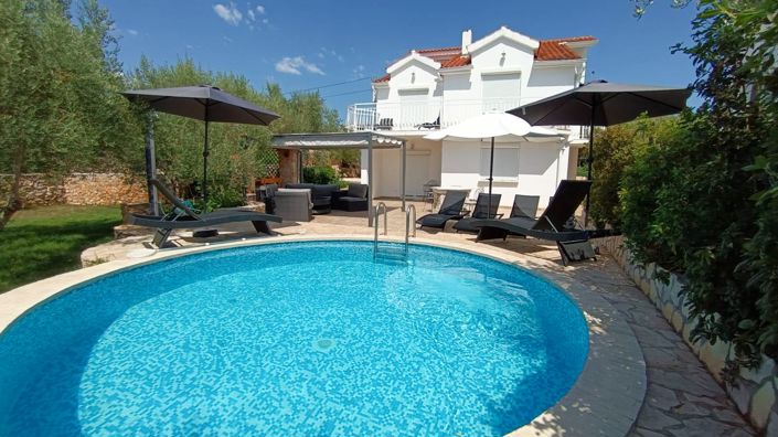 The property consists of a ground floor, first and second floors, as well as a basement, and is surrounded by greenery with numerous olive trees in the yard.The ground floor features a living room and kitchen with direct access to the garden and pool, along with a bathroom. On the first floor, there are three bedrooms, a bathroom, and an additional living room that opens onto a spacious terrace with a sea view. The second floor includes two more bedrooms. Each bedroom is equipped with its own air conditioning unit and a radiator connected to central heating.The basement contains two rooms—one currently used as a game room and the other as a storage area. The house also offers a beautiful garden with a swimming pool and olive trees, as well as a summer kitchen with a barbecue. A large parking area provides ample space for vehicles. Ref: RE-U-40420Overall additional expenses borne by the Buyer of real estate in Croatia are around 7% of property cost in total, which includes: property transfer tax (3% of property value), agency/brokerage commission (3%+VAT on commission), advocate fee (cca 1%), notary fee, court registration fee and official certified translation expenses. Agency/brokerage agreement is signed prior to visiting properties.Property advantages: Swimming pool, Storage, Garden, Detached