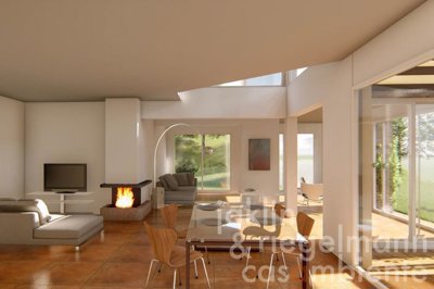 Au rez-de-chaussée, il est prévu un spacieux espace de vie ouvert avec cuisine et garde-manger attenants, qui s'ouvre sur le jardin par une véranda couverte et vitrée avec coin barbecue. Une chambre avec salle de bains privée, qui peut également être utilisée comme un appartement indépendant (par exemple comme Airbnb ou pour des invités), une toilette pour les invités et des locaux techniques complètent le rez-de-chaussée.