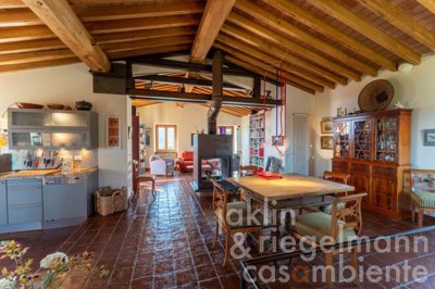 Le dernier étage, accessible soit par un escalier intérieur depuis l'entrée, soit par un escalier extérieur, mène à un salon et une salle à manger lumineux qui englobe la maison avec une cuisine moderne intégrée adjacente. La pièce est caractérisée par un haut plafond de poutres en châtaignier et un sol en terre cuite. Au centre de la pièce se trouve une cheminée moderne ouverte sur deux côtés. De nombreuses fenêtres et portes vitrées allant du sol au plafond, encastrées dans le bois de châtaignier, offrent une vue splendide à 360°. Des portes-fenêtres mènent à une autre véranda spacieuse avec une vue panoramique de rêve, qui s'ouvre dans trois directions.