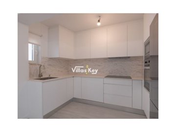 Cuisine entièrement équipée avec électroménagers modernes : plaque avec hotte intégrée, four, micro-ondes, réfrigérateur encastré, lave-linge et lave-vaisselle