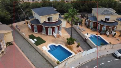 La maison est construite sur 2 étages, elle dispose d'un salon très spacieux de 50 m2 avec une cuisine française ouverte avec une fenêtre et un accès à une buanderie et un terrain, une spacieuse salle de bain complète et deux chambres doubles. A l'étage supérieur, il y a deux chambres doubles suites avec salles de bains, dont une avec une terrasse de 23 m2. Il a un terrain de 500 m2 avec une piscine 5x3. Situé à côté d'un espace vert avec des arbres et un trottoir.