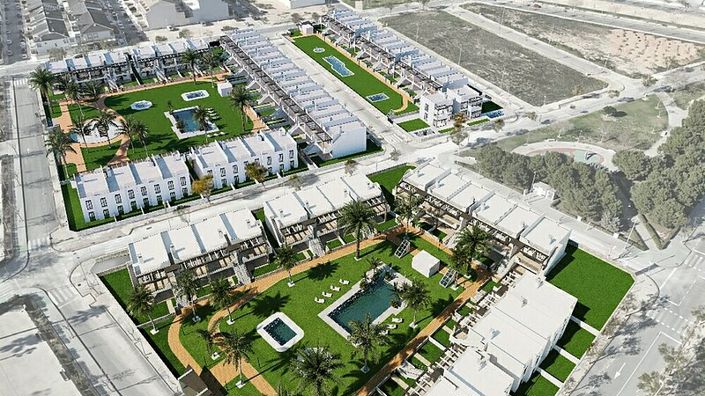 New Apartments in Pilar de la Horadada: Discover a small, exclusive complex of 35 new apartments in Pilar de la Horadada, offering an exceptional lifestyle close to the Mediterranean Sea. Apartment Features: 2 bedrooms and 2 bathrooms, high-quality finishes, air conditioning included, white goods included, exterior lighting included. Ground Floor Apartments: Generous private gardens, starting from 146m2, with prices from 296,000 euros. Top Floor Apartments: Expansive private solariums, starting from 51m2, with prices from 293,000 euros. Prime Location: Enjoy the best of coastal living with these apartments ideally situated 1.3km (a few minutes' walk) from the stunning beaches of Torre de la Horadada and El Mojon. They are also close to local cafes, restaurants, and the charming marina. The apartments are only 2km from the vibrant town of Pilar de la Horadada, offering a wide array of dining options, supermarkets, a large sports center, and a golf course on its outskirts.