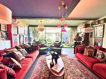 L’intérieur séduit dès l’entrée par une atmosphère chaleureuse et singulière. La pièce de vie traversante, spacieuse et lumineuse, s’ouvre directement sur le jardin grâce à de larges baies vitrées. Elle se prête à la convivialité, tout en garantissant des espaces distincts et confortables.