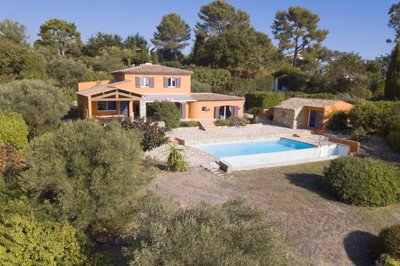Proche Valbonne : quartier résidentiel, au calme, belle villa provençale, bénéficiant d'une vue dégagée, offrant : hall d'entrée, vaste et lumineux séjour / salle à manger, cuisine américaine équipée, buanderie, 3 chambres dont 1 de plain-pied et 2 salles de bains. Terrain complanté de 2 694 m² avec bel espace piscine. Studio indépendant. Garage de 40 m².