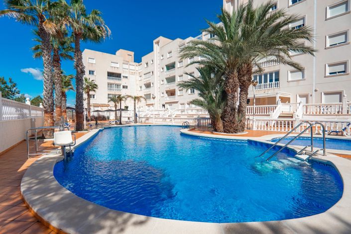 Appartement au premier étage avec ascenseur Communauté Colinas Real avec belle piscine et jardins À environ 30 minutes de l'aéroport d'Alicante Le bar populaire El Edén se trouve à proximité. Tous les services à Guardamar Idéal pour les vacances, comme investissement ou pour vivre à l'année.