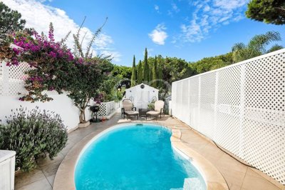 This well-maintained 2-bedroom townhouse is minutes from Ancão Beach in Vale do Garrão Resort. The main level offers an open-plan living and dining area with a fireplace, a fully equipped kitchen overlooking an outdoor dining space, and a guest toilet. The terrace features a plunge pool, lounge area, and wooden storage, ideal for relaxation. Upstairs, both ensuite bedrooms have private balconies. Located within walking distance of the beach, this renovated property is in excellent condition, making it a great holiday home or rental investment.