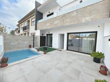 KEY READY: 3-bed, 3-bath, 130m2 villa with a dressing room in the master bedroom, lined cabinets, bathroom furniture, shower screens, and underfloor heating in bathrooms. Fitted kitchen with Balay appliances, electric blinds, air conditioning, and full lighting. Includes a private pool (pre-installed heat pump), garden, first-floor terrace, 30m2 solarium, and semi-basement. Located in San Pedro del Pinatar, 5 mins by bike to the beach and Salinas Regional Park, and close to town center amenities.