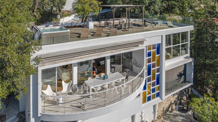 En position dominante, profitant d’une exposition plein Sud et d’une vue à couper le souffle jusqu’à la mer, cette villa de caractère séduit par son architecture inspirée des maisons californiennes des années 60 !