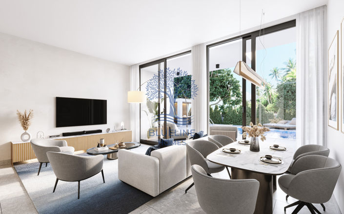 The villa is designed around a bright open-plan living, dining, and kitchen area, allowing natural light to flow throughout the home. Large windows and sliding doors provide seamless access to the private swimming pool, creating an inviting setting for outdoor relaxation or entertaining guests. An optional furnishing package is available, offering a convenient move-in-ready solution or the flexibility to personalise the interiors.