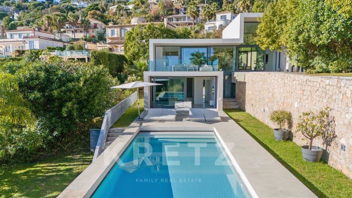 Sur les hauteurs résidentielles de Golfe-Juan, au coeur d'un environnement confidentiel et préservé, cette villa contemporaine s'inscrit dans un paysage méditerranéen d'exception, avec une vue mer panoramique embrassant le Cap d'Antibes jusqu'aux Îles de Lérins.
