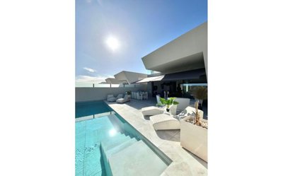 The lower level features three additional bedrooms, each with its own en-suite bathroom, as well as a games room or gym, a spacious garage, a laundry area and a large garage. The rooftop solarium offers stunning views of El Recorral Natural Park and the sea.
