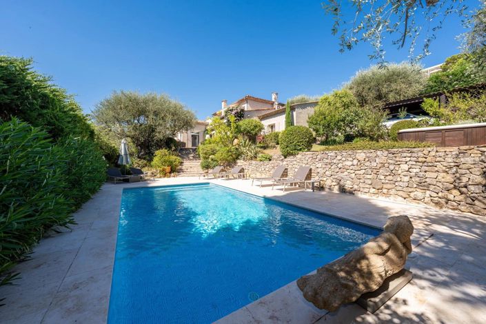 Le Cannet : quartier résidentiel, au calme, belle villa provençale, offrant : hall d'entée, vaste et lumineux séjour / salle à manger avec cheminée, cuisine équipée, 4 chambres et 3 salles de bains. Sauna, bureau, buanderie, dressings et cave à vin. Terrain complanté de 1 300 m² avec bel espace piscine et jacuzzi. Abri pour 3 voitures et parking.