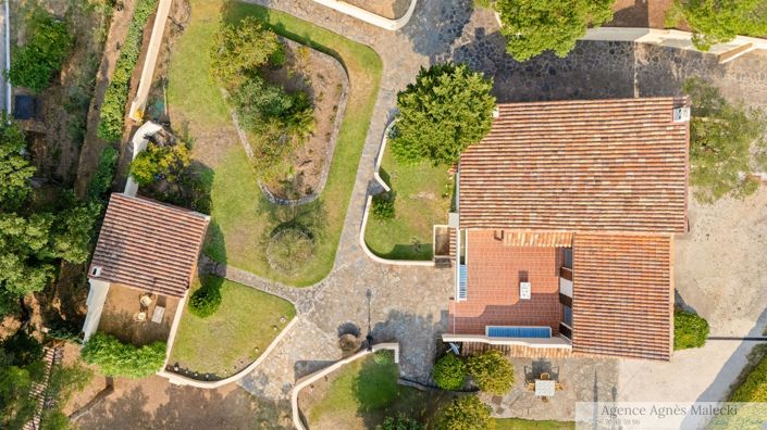 Just a few minutes from the village and the beaches, this discreet estate extends over nearly 5,000 sqm of enclosed, landscaped grounds. In a preserved natural setting, the property features an elegant Provençal villa, a swimming pool with a furnished pool house, an independent summer kitchen with fireplace, and a private tennis court. The outdoor areas, carefully designed, offer two large terraces and a flat garden planted with Mediterranean species. The entire property benefits from ambient lighting that highlights the park and pool at nightfall. Two garages and several parking spaces complete the ensemble. The main villa offers generous volumes: a living room with open kitchen of about 50 sqm, five bedrooms, three bathrooms, as well as a laundry room and a cellar. An additional annex with summer kitchen, covered terrace, and independent bedroom enhances the comfort of daily living. Overlooking the estate, a wooded plot of approximately 2.3 hectares, also part of the property, provides beautiful walking paths in an unspoiled natural environment. Just ten minutes from Bormes-les-Mimosas and five minutes from Le Lavandou, this unique property combines absolute tranquility, authenticity, and the gentle Provençal way of life. Private viewing upon request.