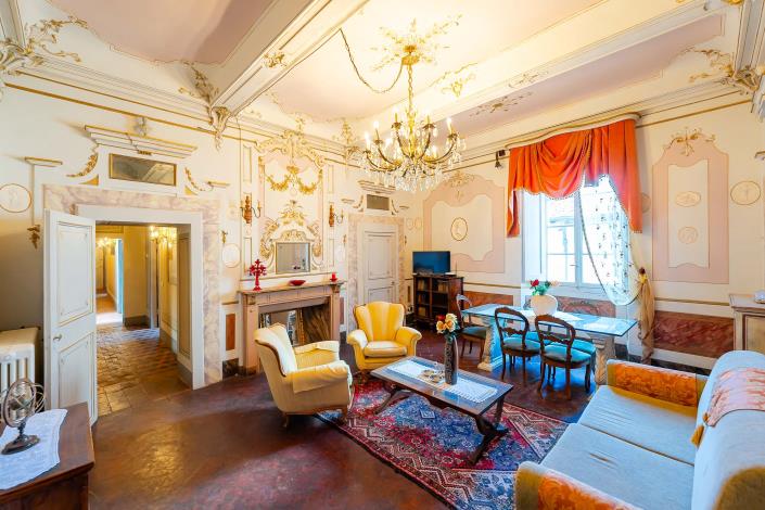 The apartment is located on the second floor of the Palazzo, in impeccable condition, and welcomes visitors with the family crest at the entrance, symbolizing the role of Imperial Vicars. Going up the elegant staircase, you enter the first reception room, a space of rare magnificence with original floors, a beautiful fireplace, decorative friezes and an imposing coffered ceiling of over three meters.