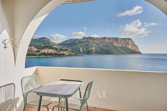 Au troisième et dernier étage d’un immeuble emblématique de Cassis profitant d’un accès mer, appartement T3 offrant une vue panoramique sur la mer, le Cap Canaille et le port.