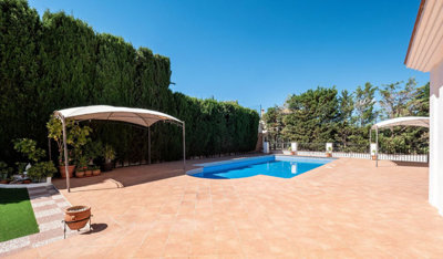 À l'extérieur, à l'arrière, se trouvent un coin cuisine, une grande pergola de 5 x 3 mètres avec un toit de tuiles, un jardin avec gazon synthétique, une fontaine et deux autres pergolas bordant la piscine. Celle-ci mesure 5 mètres sur 9,8 mètres, marches comprises (1,8 mètre supplémentaires). Sur le côté se trouve une autre terrasse bordée de massifs fleuris, un oranger, un citronnier et une buanderie équipée d'un évier, d'un lave-linge, de toilettes et d'une douche. Un escalier mène au niveau inférieur et à l'allée, agrémentée de plantations, dont deux avocatiers.