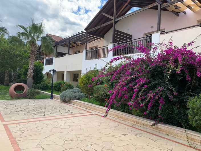 The exterior of the residential complex is equally impressive. The traditional Cypriot architectural elements, such as the terracotta-tiled roofs and wooden balconies, blend seamlessly with modern design features. The landscaped gardens are meticulously maintained, featuring a variety of local plants and flowers that add a touch of natural beauty to the surroundings. The communal swimming pool, with its spacious sunbathing area and elegant design, provides a perfect spot to relax and soak up the sun. The pool area is designed with both adults and children in mind, offering a safe and enjoyable space for all residents.