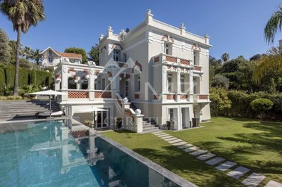 Cap d'Antibes, sur le Versant Ouest: à quelques minutes à pieds du port et des plages, cette étonnante villa datant de 1900 a été totalement rénovée de façon contemporaine avec des prestations et un design haut de gamme. La villa offre deux salons, un bureau, une salle à manger, une cuisine high tech, une buanderie, une suite de maître avec sa chambre, salon, dressing et salle de bain, et 3 chambres d'amis.
