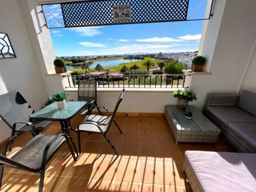 On entering this beautiful apartment you are struck by how bright and airy it is as there is not only large patio doors leading to the terrace but also an extra window. The terrace is south facing so bathed in sunshine and has the most amazing views over the golf and lake which glistens in the sunlight. The lounge is a good size and has a new upgraded AC unit. The kitchen has a tilt and turn window and can easily be made open plan if you wished. There are two double bedrooms with fitted wardrobes and remote controlled ceiling fans and both bedrooms has juliet balconies with views to the countryside and mountains. The family bathroom is a good size and has a bathtub. This property comes furnished and has gas central heating, underground parking and lift access to all floors.