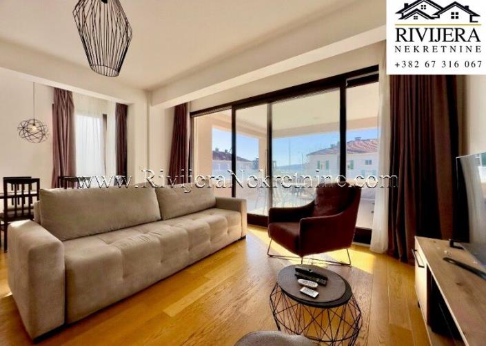 A spacious, modernly furnished two-bedroom apartment of 96 m² with a garage space is for sale. It is located on the first floor of a high-quality building, in close proximity to Porto Montenegro.