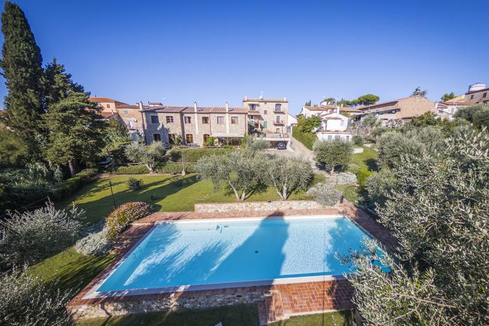 The residence is accessed via an automatic entrance gate and a private communal entry, shared with only three other units, ensuring peace and privacy. The meticulously maintained grounds include a lush garden and a panoramic pool area where one can unwind and take in the breathtaking vistas of the Tuscan hills.