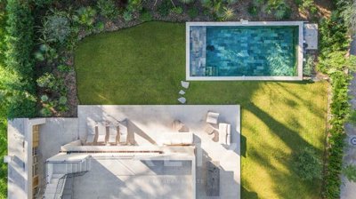 Le terrain, entièrement paysagé par un maître d'oeuvre, entoure une piscine miroir aux reflets azur. Mais le point d'orgue de cette propriété se situe sur les hauteurs : un toit-terrasse spectaculaire offrant une vue panoramique sur le Golfe de Saint-Tropez. Un lieu hors du temps pour admirer le coucher du soleil.