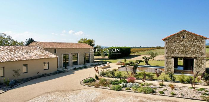 Le terrain d'un hectare propose un jardin paysager, une calade préservée, une fontaine, une piscine à débordement intérieure-extérieure installée dans une grange, des oliviers centenaires et d'anciennes vignes.
