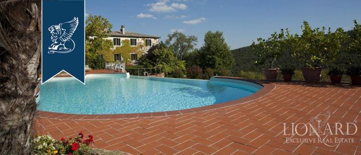 This Tuscan estate for sale near Siena, located 420 meters above sea level, consists of eight independent apartments linked together by a stylistic and structural continuum. The complex boasts a total area of 1.800 sq m, is surrounded by 161 hectares of land and includes a splendid swimming pool with soft and gentle lines.