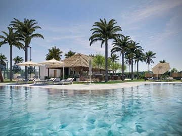 Gated resort with options for 2/3 bedrooms and 2 bathrooms, terrace on the first floor and solarium for the upper floor. The interiors, elegant and functional with high quality flooring, fully fitted kitchens including electrical appliances. The bathrooms have a vanity unit with washbasin and light. The bedrooms include lined wardrobes with drawers and sliding doors and each property has pre-installation for ducted air conditioning.