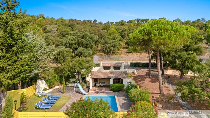 Bormes Campagne Non Loin De Bormes Et De Son Célèbre Village Ainsi Que Des Plages Le domaine comprend une zone clôturée d’environ 5 000 m2, à l'intérieur de laquelle se trouve un jardin aux allures de parc avec une villa provençale, une cuisine d'été séparée avec cheminée, une piscine de 10 x 4,50 m séparée de la villa avec terrasse, bar et cuisine, ainsi qu’un pool house entièrement meublé. Deux garages séparés d’environ et un court de tennis complètent l’ensemble. La maison est située dans un quartier très calme et dans une zone préservée. La villa est accessible par une allée menant à un parking pour plusieurs voitures. Les bâtiments et installations sont reliés par de larges chemins en pierre naturelle. Le jardin plat est composé d’arbres et arbustes méditerranéens, de pelouses et de massifs fleuris. Deux grandes terrasses, dont une partiellement couverte de 40 m2 et une autre de 30 m2, prolongent les espaces extérieurs. Le soir, l’ensemble du parc et la piscine bénéficient d’un bel éclairage. Au-Dessus du court de tennis se trouve un espace partiellement clos d’environ 2,3 hectares (23 000 m2), boisé et appartenant également à la propriété. De là, il est possible de faire de belles promenades dans les environs. L’Environnement est verdoyant, riche en nature et en plantes exotiques. Au rez-de-chaussée : entrée, hall, séjour avec cuisine ouverte d’environ 50 m2, deux chambres d’environ 12 m2 avec placards intégrés, une salle de bains et un Wc séparé. À l’étage : chambre d’environ 15 m2 avec placard intégré et salle de bains avec baignoire, lavabo et Wc, donnant accès à un petit grenier. Une buanderie d’environ 20 m2 avec équipements, un séjour avec petite cuisine (environ 30 m2) et une salle de bains attenante avec lavabo, douche et Wc complètent ce niveau. Une chambre d’environ 15 m2 avec douche et lavabo attenants ainsi qu’une deuxième chambre d’environ 10 m2 avec Wc séparé. Enfin, une cave d’environ 30 m2. Annexes : au rez-de-chaussée, séjour avec espace de stockage et salle d’eau avec douche et lavabo, cuisine d'été avec bar, terrasse et patio avec Wc. À l’étage, chambre d’environ 14 m2. Bormes-Les-Mimosas se situe à seulement 10 minutes et est considéré comme l’un des plus beaux villages de la Côte d’Azur, idéalement placé entre Saint-Tropez (40 km) et Toulon (30 km). Dans un rayon de 6 km, on trouve six plages de sable, et Le Lavandou, n'est qu'à 5 km. Une propriété rare où nature, calme et authenticité se conjuguent avec confort et intimité. Venez découvrir ce domaine unique et laissez-vous séduire par son cadre exceptionnel. Contactez-Moi dès aujourd’hui pour organiser une visite privée.