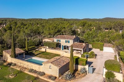 Les espaces extérieurs se composent d?un jardin paysager accueillant une piscine chauffée au sel de 10 x 5 mètres, bordée d?un auvent. Le terrain est complanté de lavandes, cyprès et d?une petite oliveraie à l?entrée, offrant une arrivée particulièrement accueillante. Un magnifique chêne vert vient ombrager la terrasse et participe pleinement à l?atmosphère provençale du lieu.