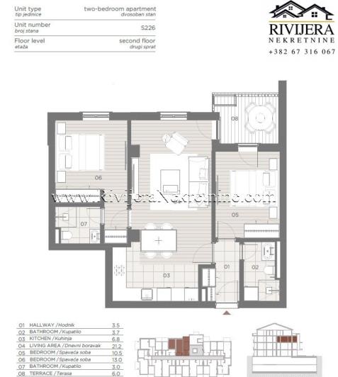For sale, a two-bedroom apartment with a total area of 67.4 m² in a modern building under construction at the location of Topla 2. High-quality construction and materials, elevator, underground garage, and warranty on the work performed. Functional layout: hallway, living room with kitchen, two bedrooms, two bathrooms, and a spacious terrace. Ideal for living or investment. €15,000 garage space
